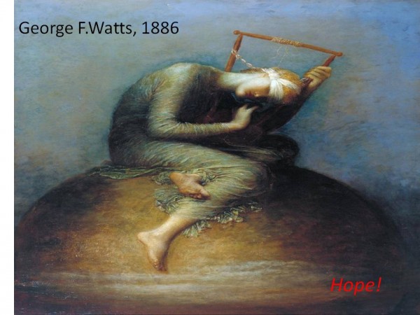 한 여인이 바다에 떠 있는 커다란 공 위에 위태로운 자세로 앉아 있습니다. 가까스로 공 위에 걸터앉은 모습이 매우 불안해 보입니다. 공은 우리가 사는 우주예요. 와츠는 인간이 사는 우주가 공처럼 위험하다는 것을 나타내기 위해 우주를 공으로 표현한 것입니다.  금방이라도 바다로 미끄러질 것 같은 저 여인을 보세요.눈은 가려져 있어요. 그러나 앞을 볼 수 없는 상황에서도 포기하지 않고 수금을 연주하고 있지요. 악기의 줄은 다 끊어지고, 오직 한 줄만이 외롭게 남아 있어요. 가냘픈 저 줄도 언제 끊어질지 모른답니다.  그러나 사람은 아무리 어려운 일을 당해도, 결코 희망을 잃지 않는 존재예요. 그림 속의 사람처럼, 줄이 끊어지는 순간까지 아름다운 음악을 연주한답니다.  이 그림을 그릴 당시, 와츠는 매우 힘든 생활을 하고 있었어요. 수 년 동안 실패를 거듭해 크게 실망한 상태였답니다. 와츠는 희망을 잃고 싶지 않은 자신의 심정을 이 그림을 통해 보여 주고 있어요. 그림을 그리면서 자꾸만 약해지는 마음을 강하게 단련시켰답니다